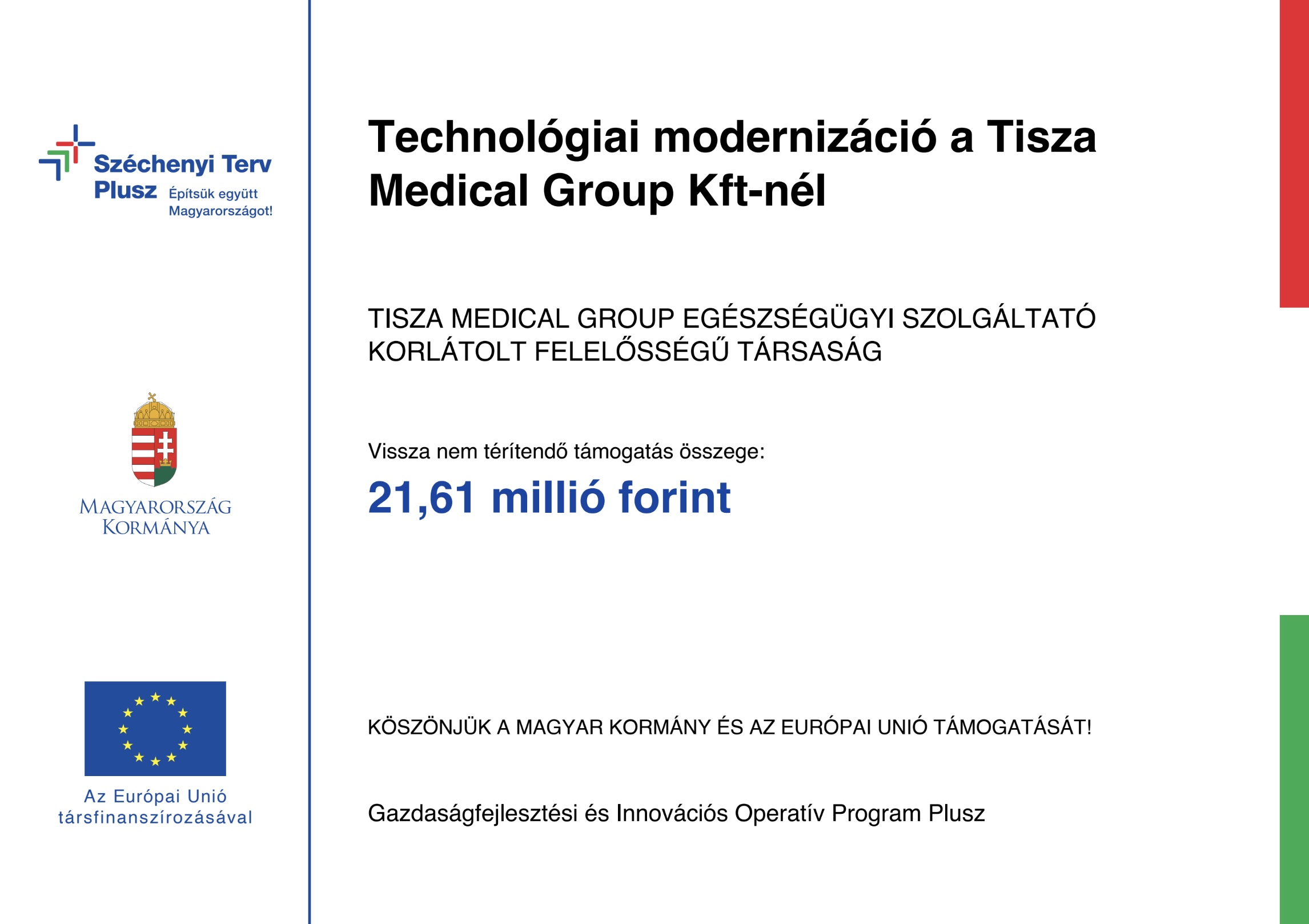 Elindult a Tisza Medical Group Egészségügyi Szolgáltató Korlátolt Felelősségű Társaság technológiai modernizációs projektje Szegeden. A projekt keretében eszközbeszerzés és üzleti felhőszolgáltatás igénybevétele valósul meg. A beruházás a Gazdaságfejlesztési- és Innovációs Operatív Program Plusz keretében valósul meg 21,6 millió forint vissza nem térítendő európai uniós támogatás segítségével.